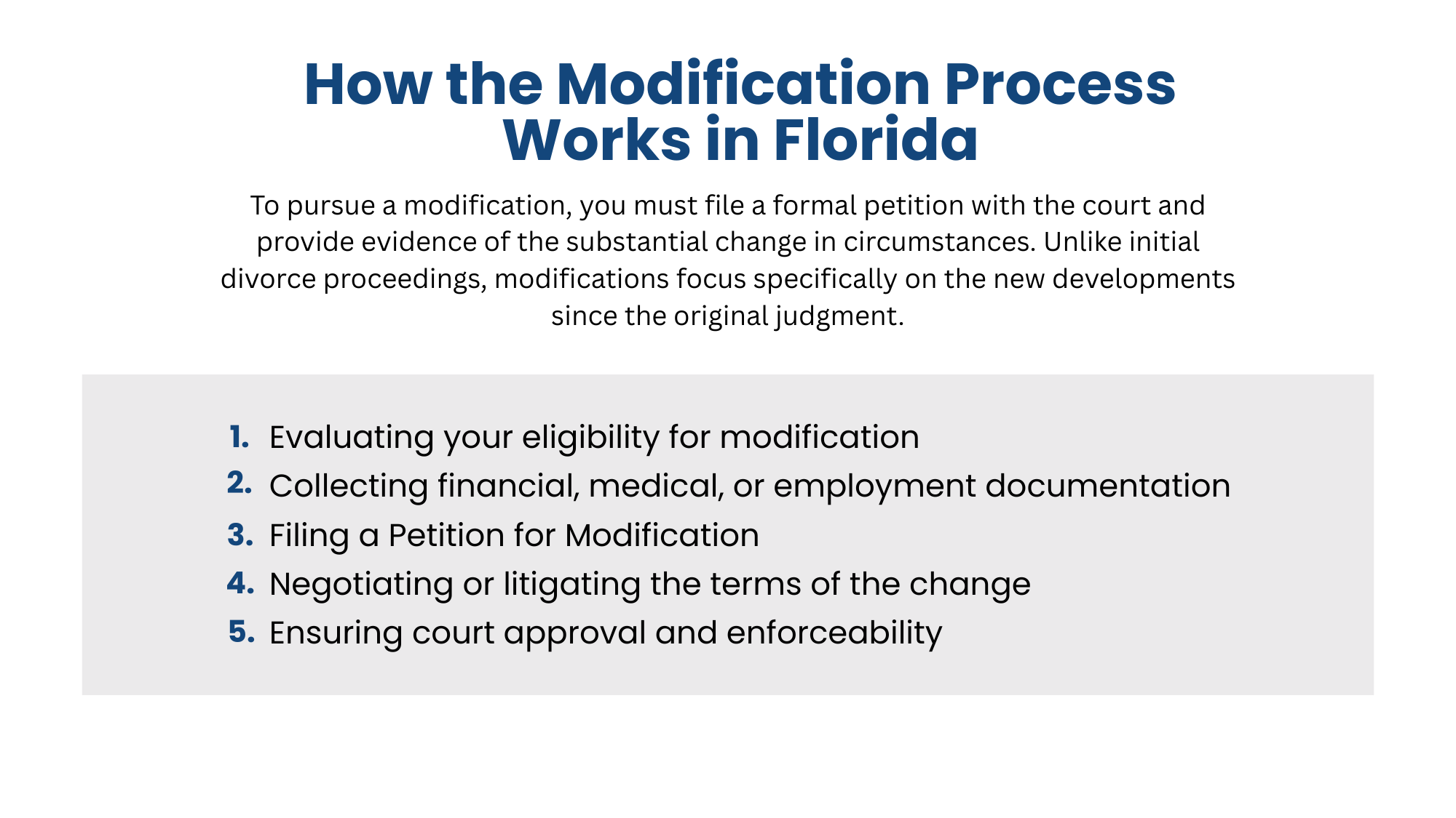 A post-judgment divorce modification is a legal change to the terms of a final judgment of divorce or parenting plan. Florida courts allow modifications to alimony, child support, parenting plans, and time-sharing agreements when there has been a substantial, material, and unanticipated change in circumstances.